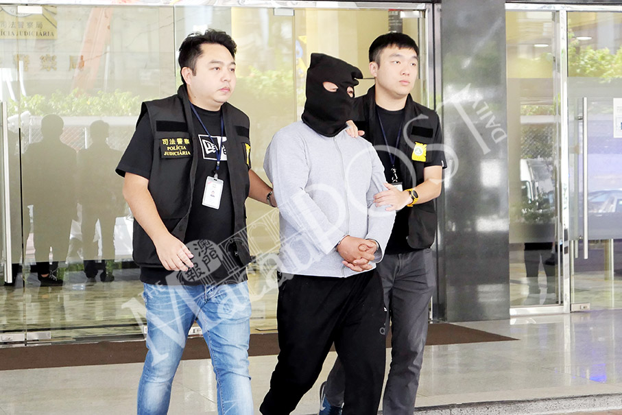 Judiciary Police (PJ) officers escort the hooded suspect from the PJ headquarters to a vehicle yesterday.