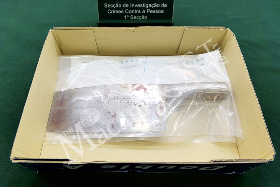 The blood stained cleaver seized by the police in the attack is displayed in a pressroom of the PJ headquarters yesterday. Photos: Iong Tat Choi