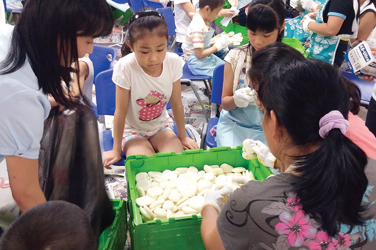 Macau General Union of Neighbourhood Association (UGAMM) volunteers pack soap bars. Photos: Clean the World