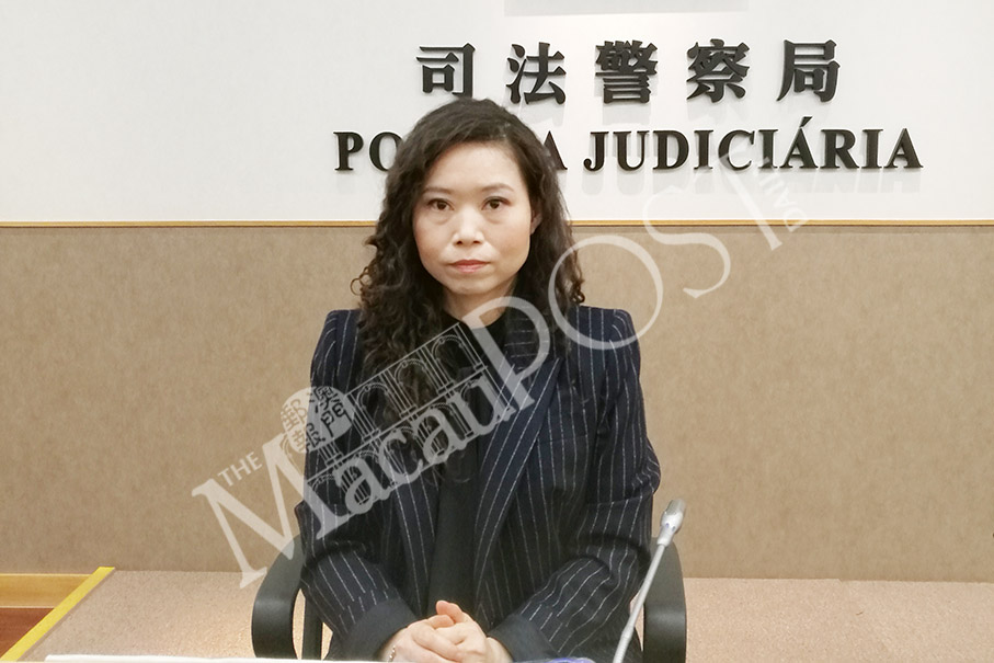 Judiciary Police (PJ) spokeswoman Lei Hon Nei poses before yesterday’s regular press conference yesterday in a pressroom at the PJ headquarters in Zape. Photo: Kristy Chan