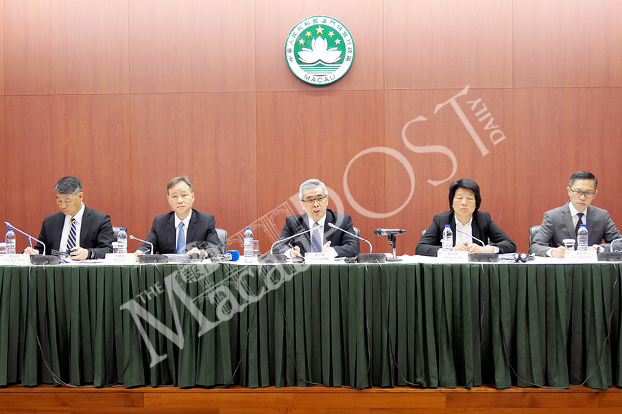 Secretary for Security Wong Sio Chak (centre) speaks during yesterday’s press conference at the S. Francisco Barracks about the city’s Q1 to Q3 crime statistics, as his chief-of-cabinet Cheong Ioc Ieng (second from right), Unitary Police Service (SPU) Commissioner-General Ma Io Kun (second from left), Public Security Police (PSP) Commissioner Leong Man Cheong (first from left) and Judiciary Police (PJ) Director Sit Chong Meng look on. Photo: Iong Tat Choi