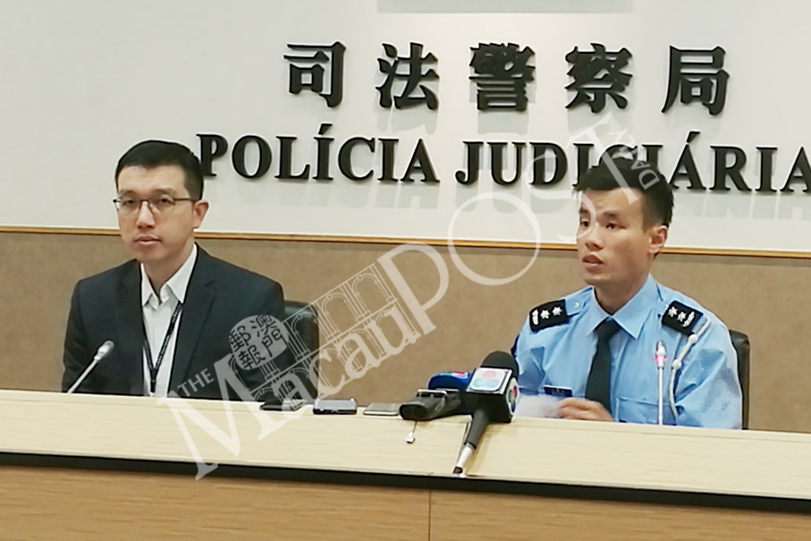 Public Security Police (PSP) spokesman Ho Ka Kit (right) answers journalists’ questions as Judiciary Police (PJ) spokesman Choi Ian Fai looks on, during yesterday’s regular press conference by Macau’s two police forces. Photo: Kristy Chan