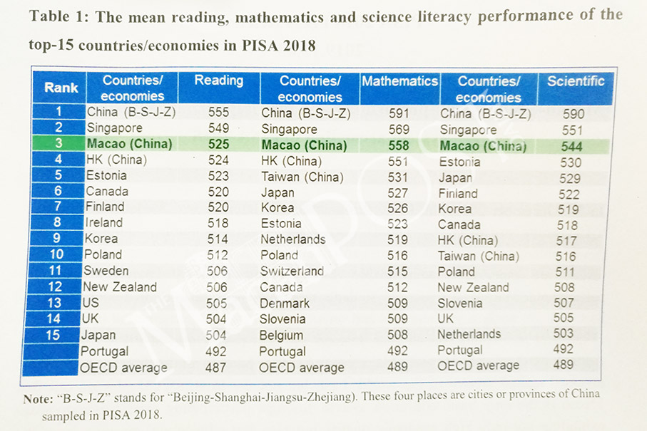 The results were announced locally at the same time as they were released by the PISA organisation at the Economic Cooperation and Development’s (OECD) headquarters in Paris, which was 9 a.m. Paris time while it was 4 p.m. in Macau.