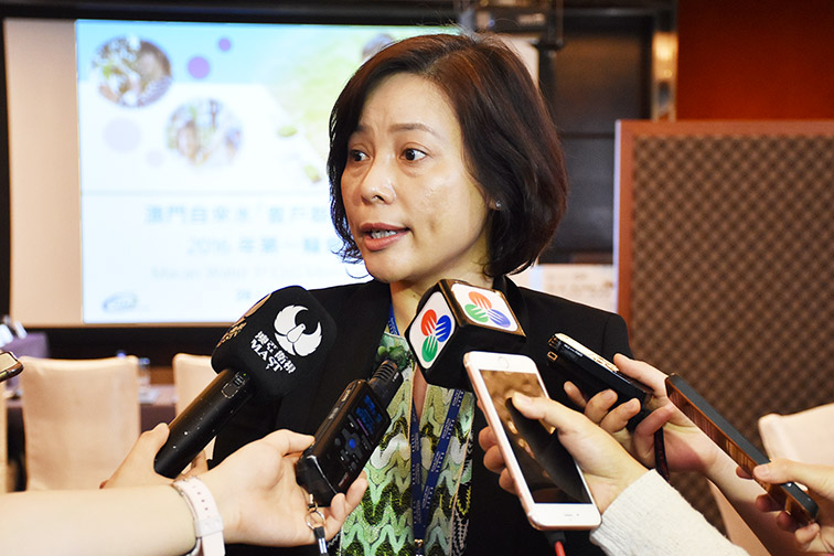 Macao Water Executive Director Nacky Kuan Sio Peng speaks to reporters on the sidelines of a Customers Liaison Group meeting at the Mandarin Oriental Hotel yesterday. Photo: Leong Lok Ian