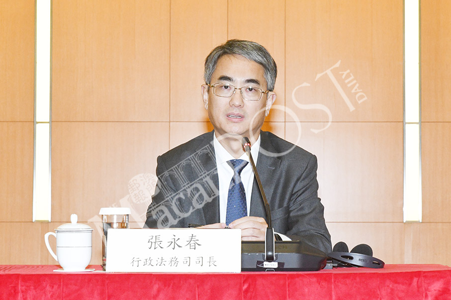 Secretary for Administration and Justice André Cheong Weng Chon speaks during yesterday’s press conference at Government Headquarters. Photo: GCS