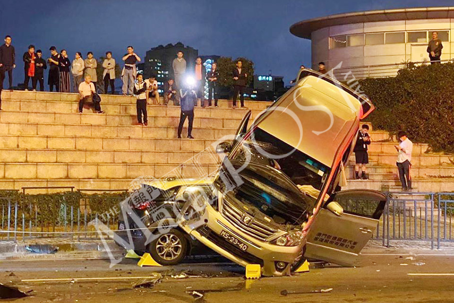 This photo downloaded from Facebook yesterday shows the aftermath of Monday night’s spectacular three-vehicle traffic accident in front of Macau Grand Prix Building in the Outer Harbour area.