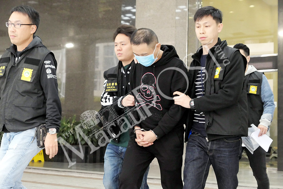 Judiciary Police (PJ) officers escort the blackmail suspect to a PJ vehicle outside the PJ headquarters in Zape yesterday. Photo: Iong Tat Choi