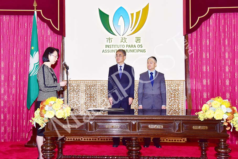 Newly-appointed Municipal Affair Bureau (IAM) Vice President O Lam (left) is sworn in yesterday, witnessed by Secretary for Administration and Justice André Cheong Weng Chon (centre) and his chief-of-cabinet Ng Chi Kin, at the IAM headquarters in Avenida de Almeida Ribeiro. Photo: IAM