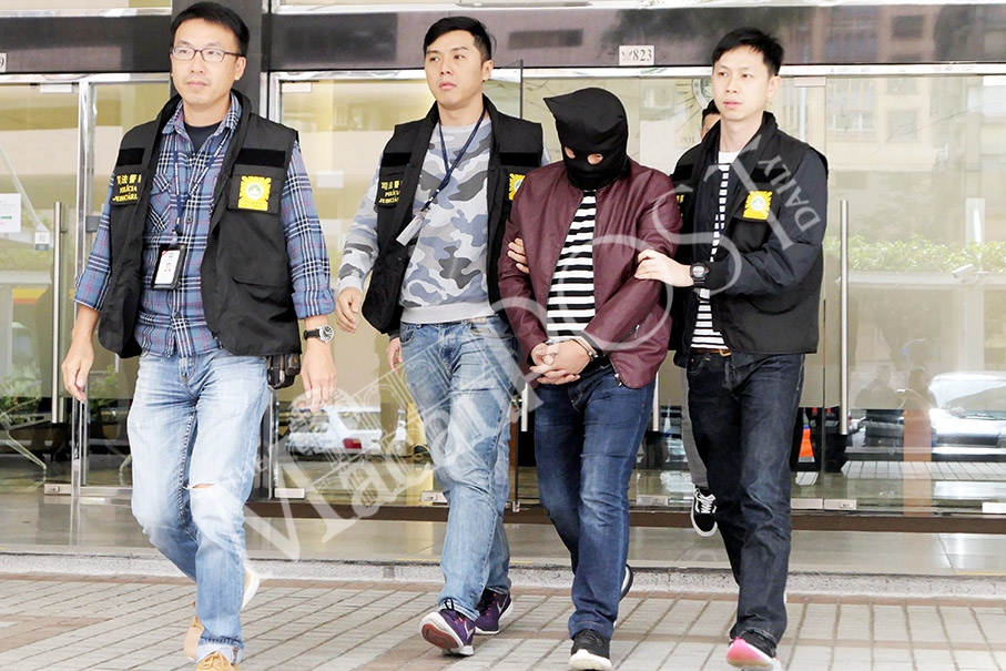 Judiciary Police (PJ) officers escort the hooded burglary suspect to a PJ vehicle outside the PJ headquarters in Zape yesterday. Photos: Iong Tat Choi