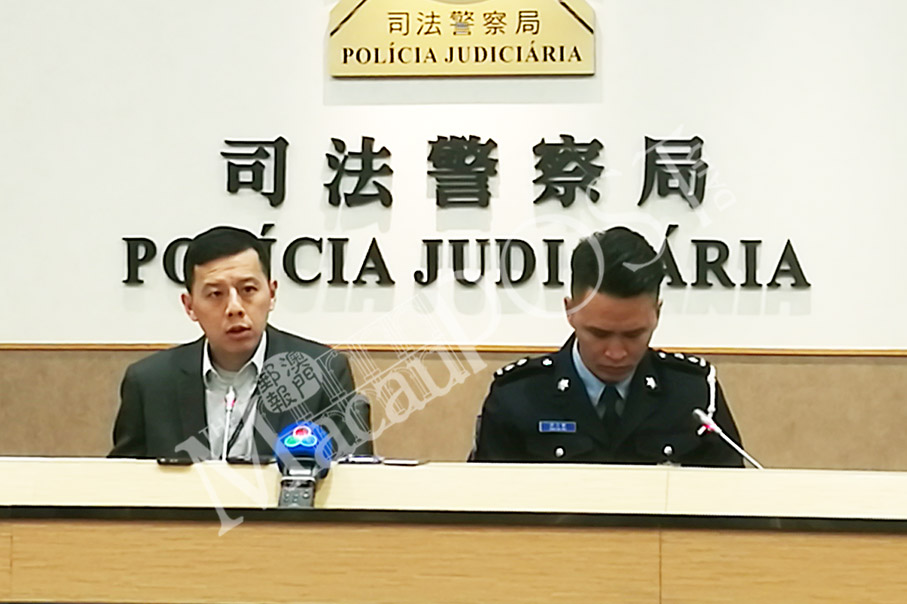 Judiciary Police (PJ) spokesman Chan Wun Man (left) addresses yesterday’s regular press conference while Public Security Police (PSP) spokesman Choi Iok Kin looks at his files. Photo: Kristy Chan