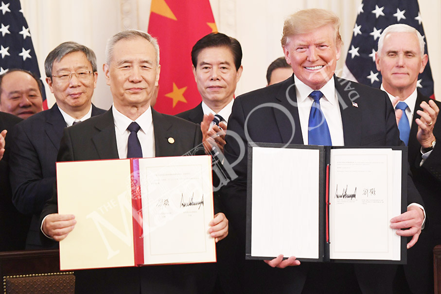 Vice Premier Liu He (left, seated) and US President Donald Trump sign a first-phase trade agreement between the US and China in the East Room of the White House in Washington, DC, yesterday. – AFP