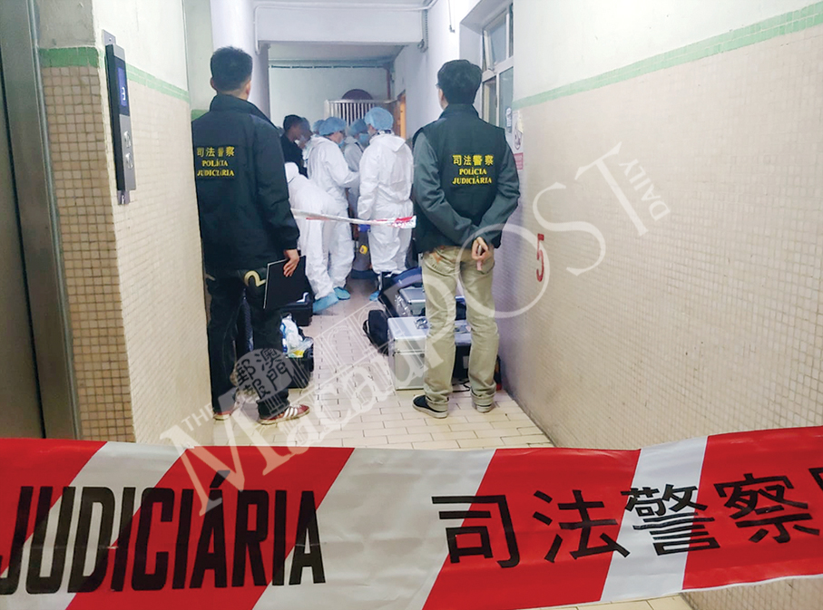 Police officers work at the crime scene in a residential building in Areia Preta last night. Photo: Iong Tat Choi