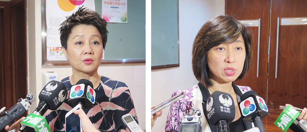SJM Managing Director and Chief Administrative Officer Angela Leong On Kei (left) and Wynn Macau Executive Director Linda Chen speak to the local media on the sidelines of a seminar on gaming companies’ “professional training and nurturing local talents” at the Macau Polytechnic Institute (IPM) in Zape yesterday. Photos: Davis Ip