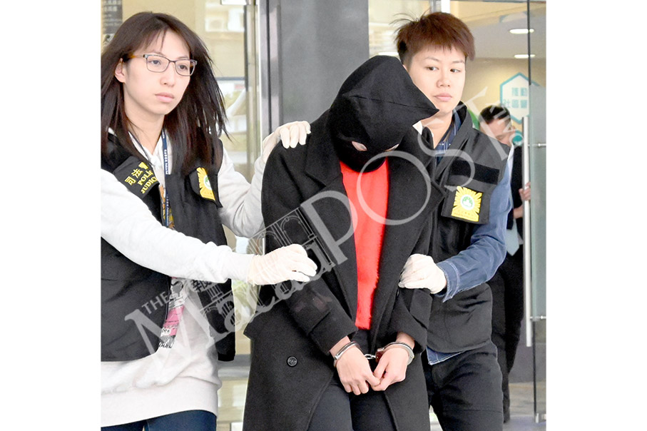 The hooded murder suspect is escorted by Judiciary Police (PJ) officers from the PJ headquarters in Zape to a vehicle yesterday. Photos: Iong Tat Choi