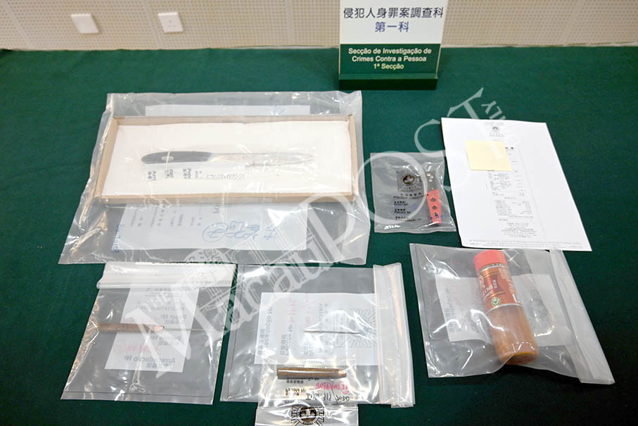 Evidence seized from the murder suspect such as ice picks and knives are displayed during yesterday’s press conference about the case at the pressroom of the Judiciary Police (PJ) headquarters.