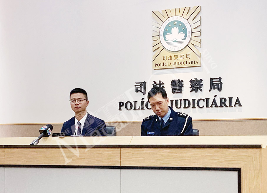 Judiciary Police (PJ) spokesmen Leng Kam Lon (left) and Public Security Police (PSP) spokesman Cheong Heon Fan host yesterday’s press conference. Photo: Camy Tam