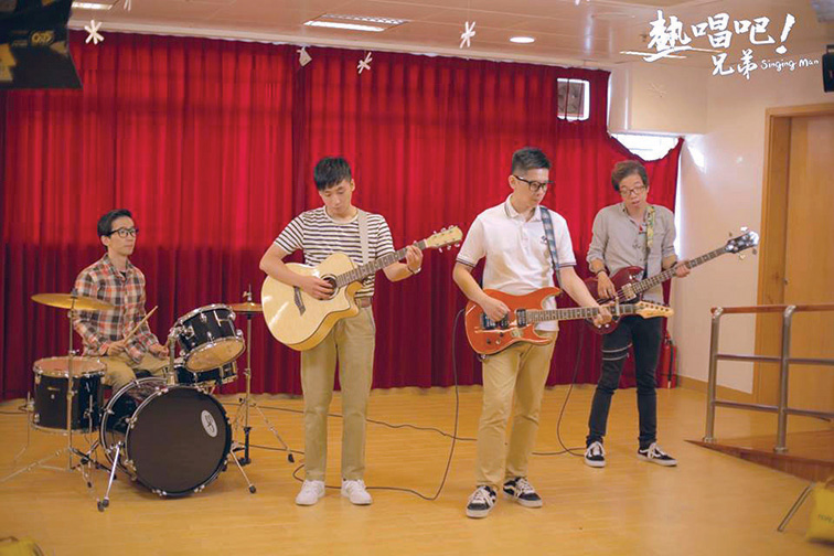 Endy Leong Chin Hong (second left) practises music with Life Band for the film “Singing Man”. All images are provided by Fuhong Society of Macau