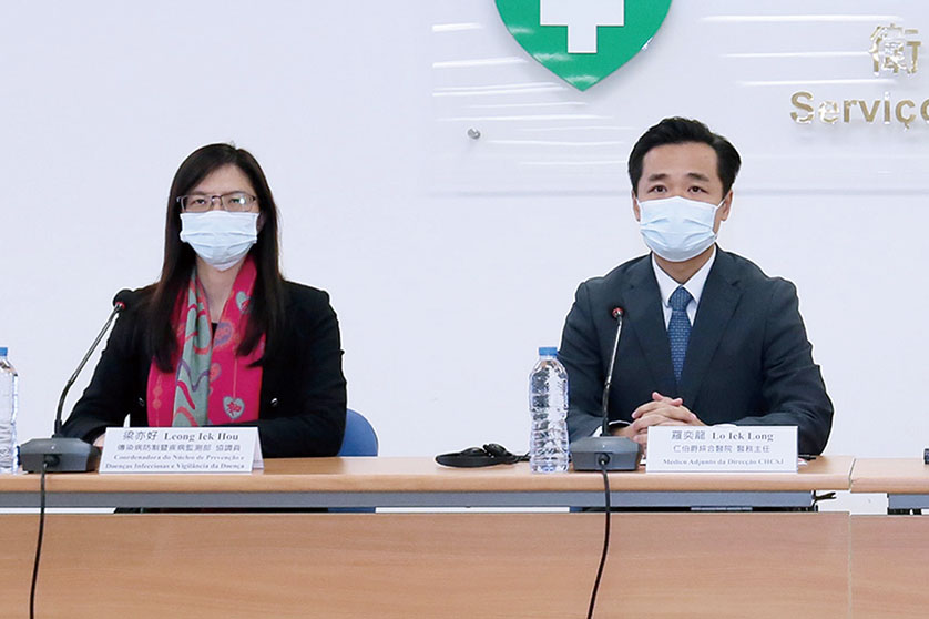 Lo Iek Long (right), clinical director of the public Conde de São Januário Hospital Centre, and the Health Bureau’s (SSM) Control of Communicable Diseases and Surveillance of Diseases Department Coordinator Leong Iek Hou pose during yesterday’s press conference at the bureau about the city’s novel coronavirus (COVID-19) situation. Photo: GCS