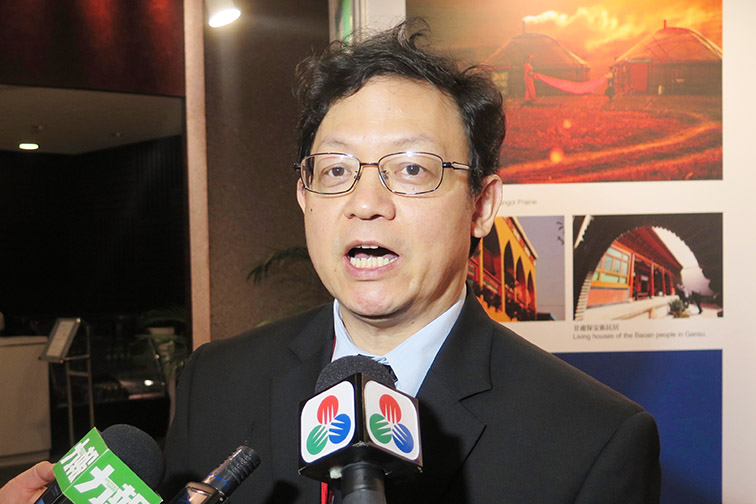 Education and Youth Affairs Bureau (DSEJ) Deputy Director Lou Pak Sang speaks to the media on the sidelines of the opening ceremony of a photo exhibition at the Bank of China Building yesterday. – Photo: Davis Ip