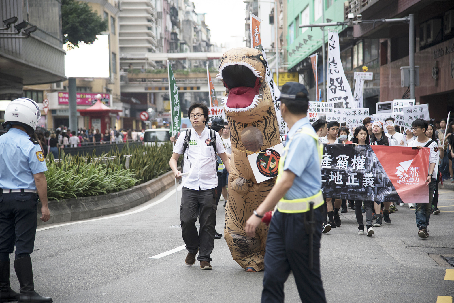 New Macau Association (NMA) President Scott Chiang Ming Hin (second from left, front) marches with a fellow member dressed in a dinosaur costume in Rua do Campo during Sunday’s May Day Protest. – Photo: MPDG