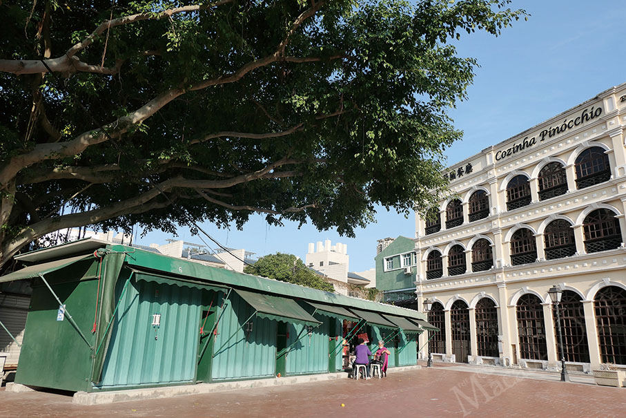 Two women chat at the only vendor stall open in Taipa Old Village.