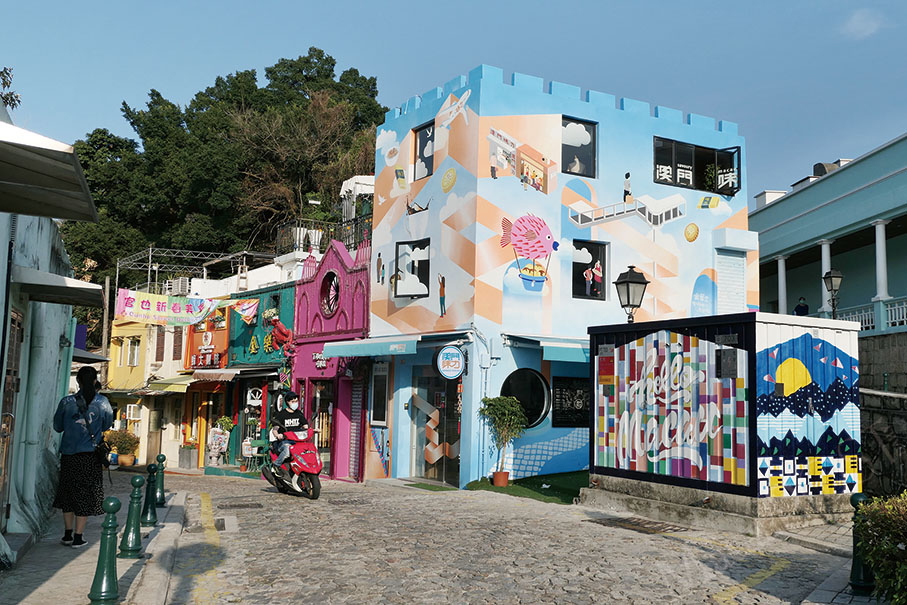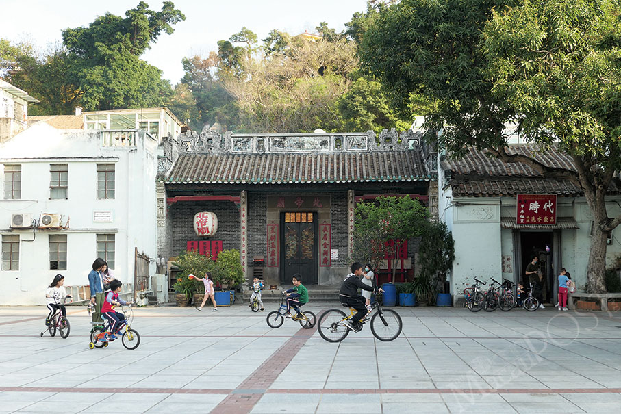 Children ride bicycles in the square in front of Pak Tai Temple in Taipa Old Village.