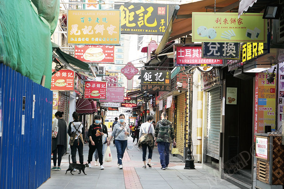 A man wearing a facemask rides his scooter along Calcada do Quartel in Taipa.