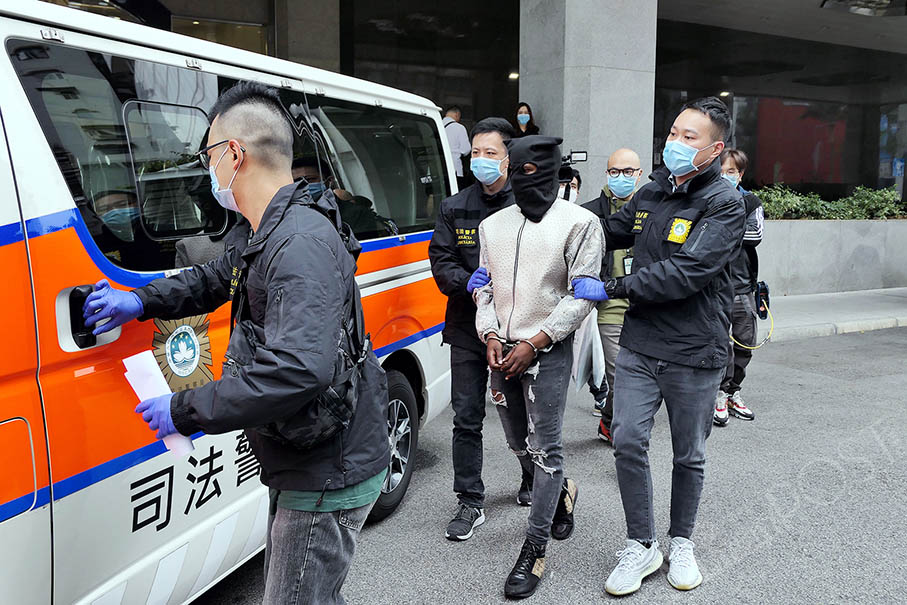 The hooded South African suspect is escorted by Judiciary Police (PJ) officers from the PJ headquarters in Zape to a vehicle yesterday. – Photos: Iong Tat Choi