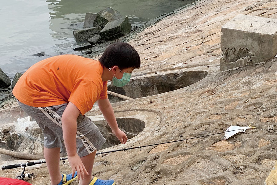 A child wearing a mask takes a look at a fish he caught in the waters near the Outer Harbour Ferry Terminal.