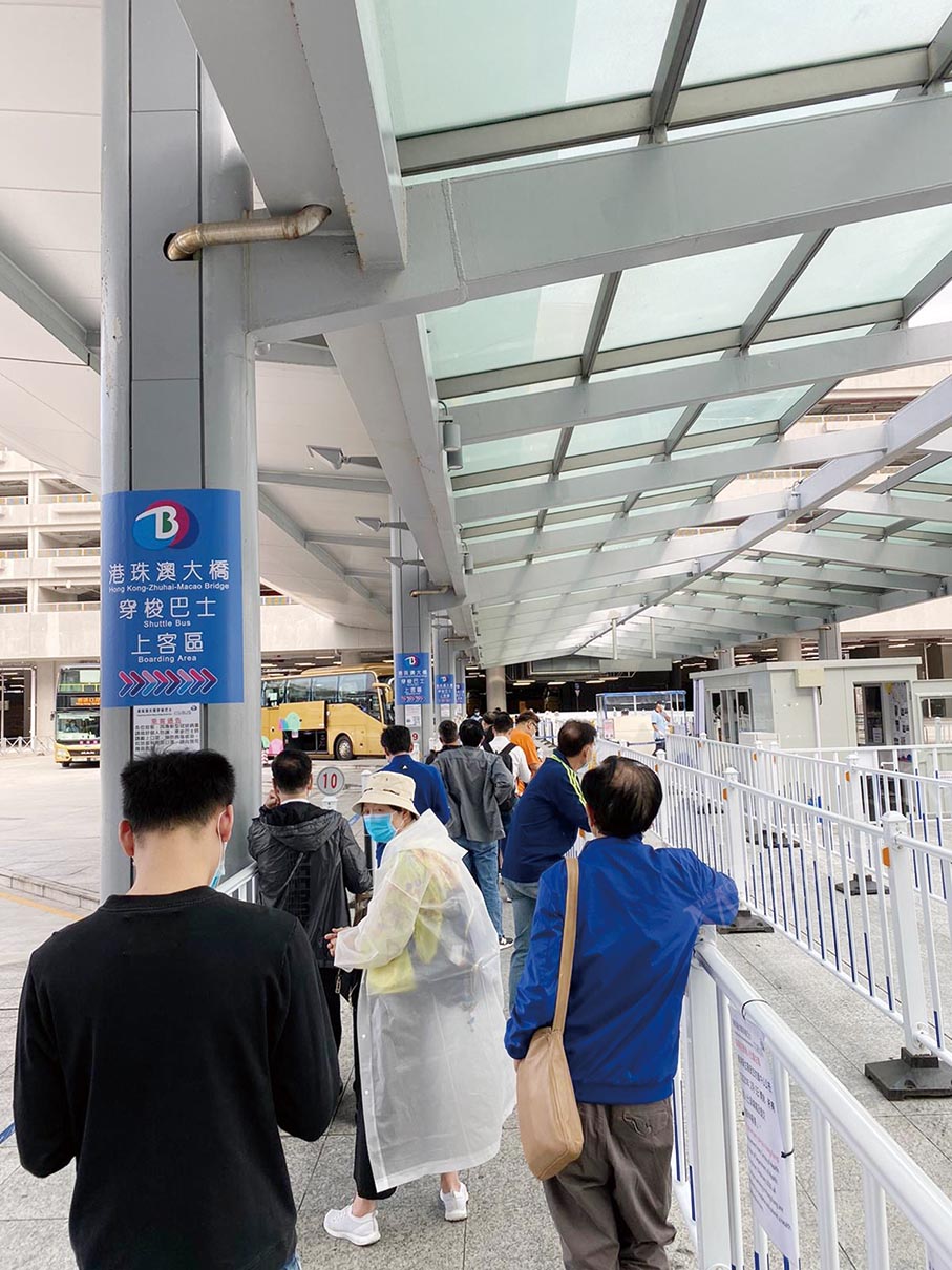 A woman wearing a facemask, a hat and a raincoat, as well as other passengers, wait to get on a Macau-Hong Kong shuttle bus at the Macau side of the Hong Kong-Zhuhai-Macau Bridge.