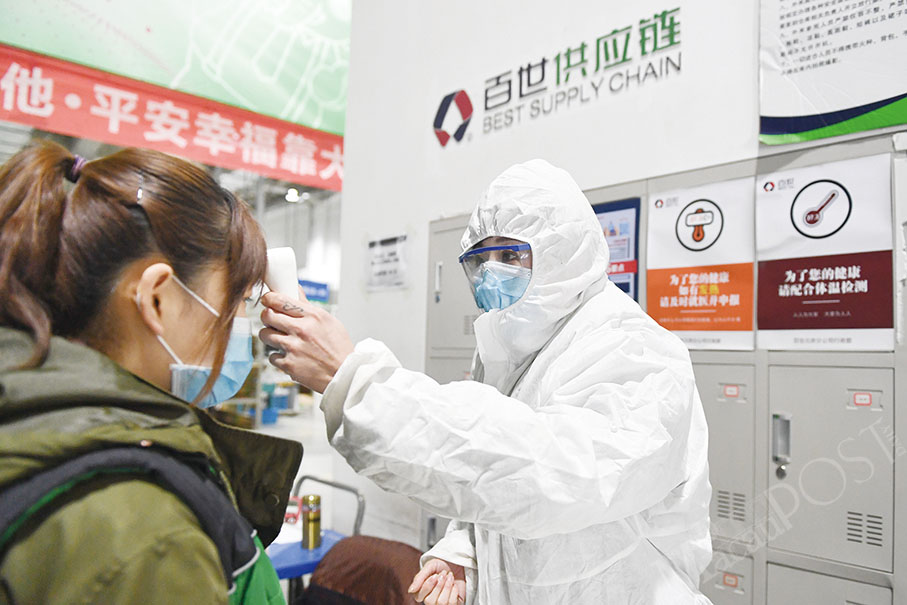 A worker checks a colleague’s body temperature at a logistics center in Beijing yesterday. The center handles some 50,000 orders daily as it has resumed operation amid COVID-19 epidemic prevention and control efforts. – Xinhua