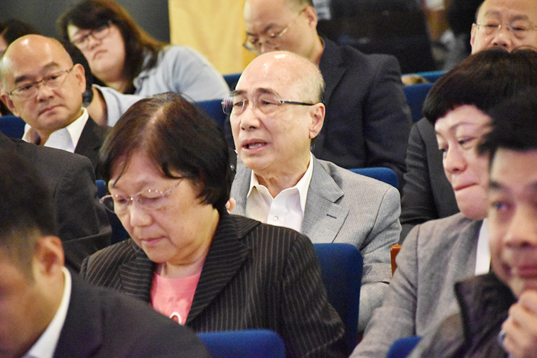 Lawmaker-cum-businessman Vitor Cheung Lap Kwan (centre) speaks during yesterday’s Five-Year Development Plan briefing session in the legislative chamber yesterday. Photo: Leong Lok Ian