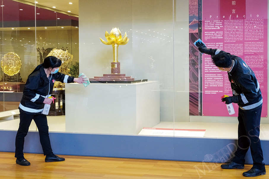 The undated handout photo downloaded from the Macau Cultural Affairs Bureau (IC) shows cleaners at work at the Macau Handover Gifts Museum in Nape.