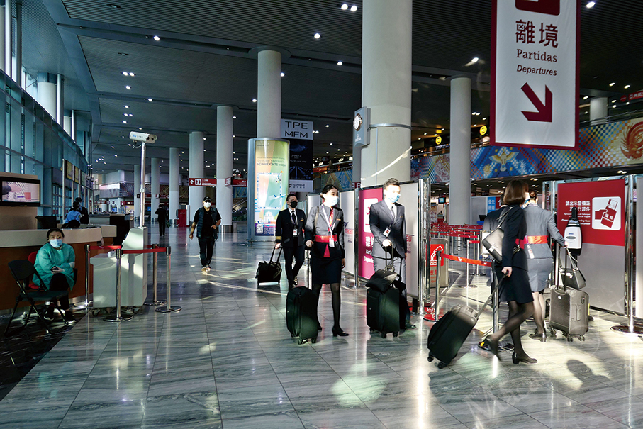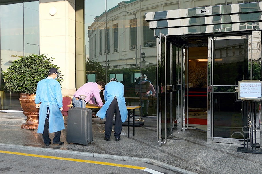 Staff members assist a man (centre) in delivering personal belongings to those who are undergoing quarantine at the Golden Crown China Hotel in Taipa.