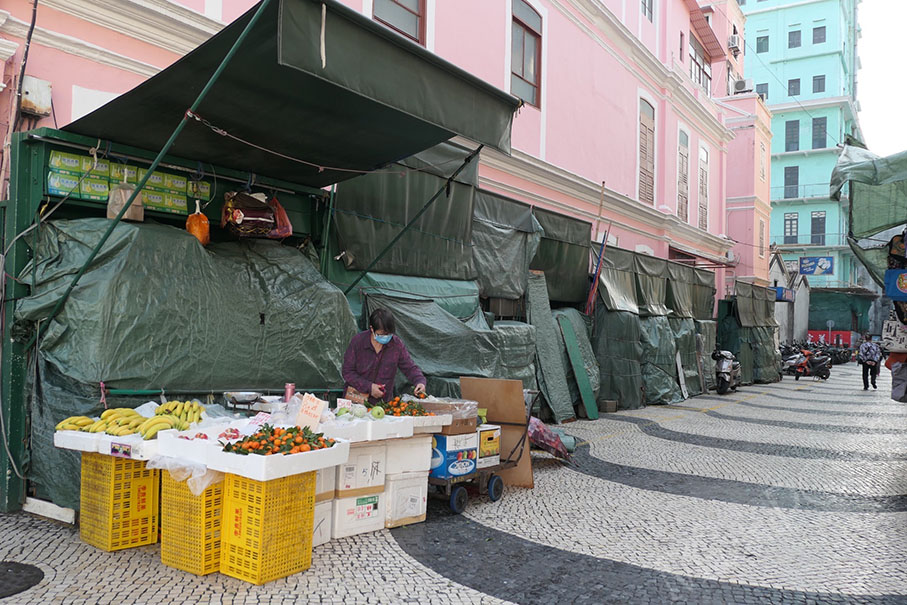A fruit vendor, wearing a facemask, checks her products while the stalls next to hers are closed.