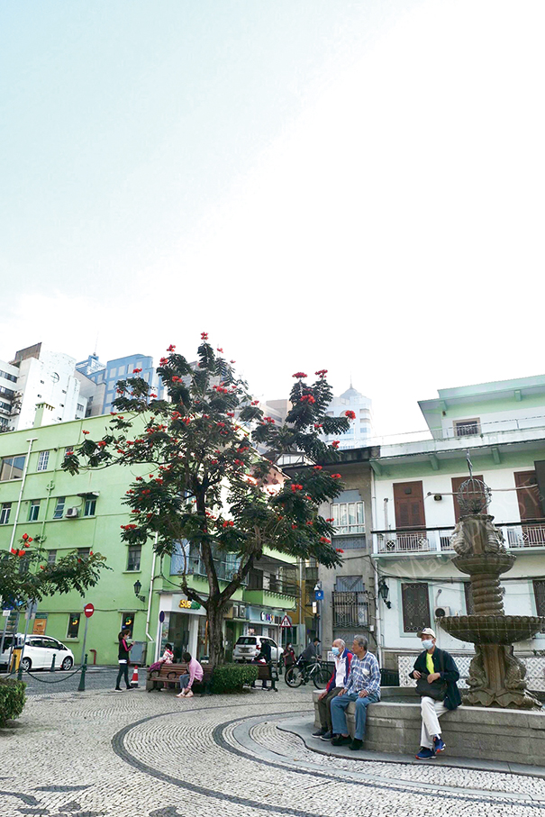 People, all but one wearing a facemask, sit around the fountain and under a tree to enjoy the sun in the afternoon near the Cathedral in the city centre.