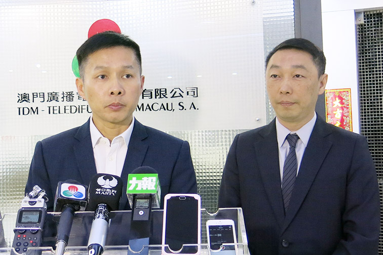 Economic Services Bureau (DSE) Director Tai Kin Ip (left) talks to reporters after taking part in yesterday’s phone-in programme on government broadcaster TDM while Consumer Council Executive Committee member Lewis Chan Hon Sang looks on. Photo: Ian Sio Tou