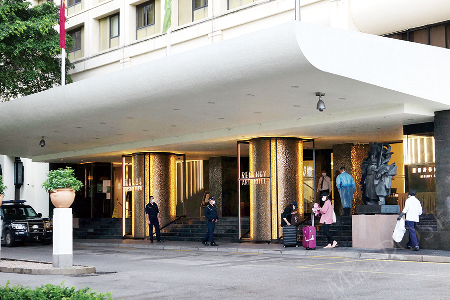 People with their suitcases are seen outside Regency Art Hotel, which has been Macau’s third “quarantine hotel” since yesterday.