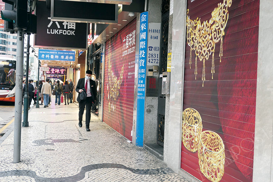 Pedestrians walk past jewellery shops that have been closed since early last month.
