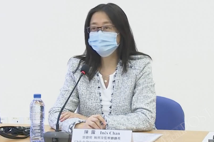 Inês Chan Lou, who heads the Macau Government Tourism Office’s (MGTO) Licensing and Inspection Department, addresses yesterday’s press conference at the Health Bureau (SSM) about the city’s novel coronavirus (COVID-19) situation. Photo: GCS