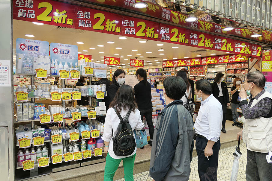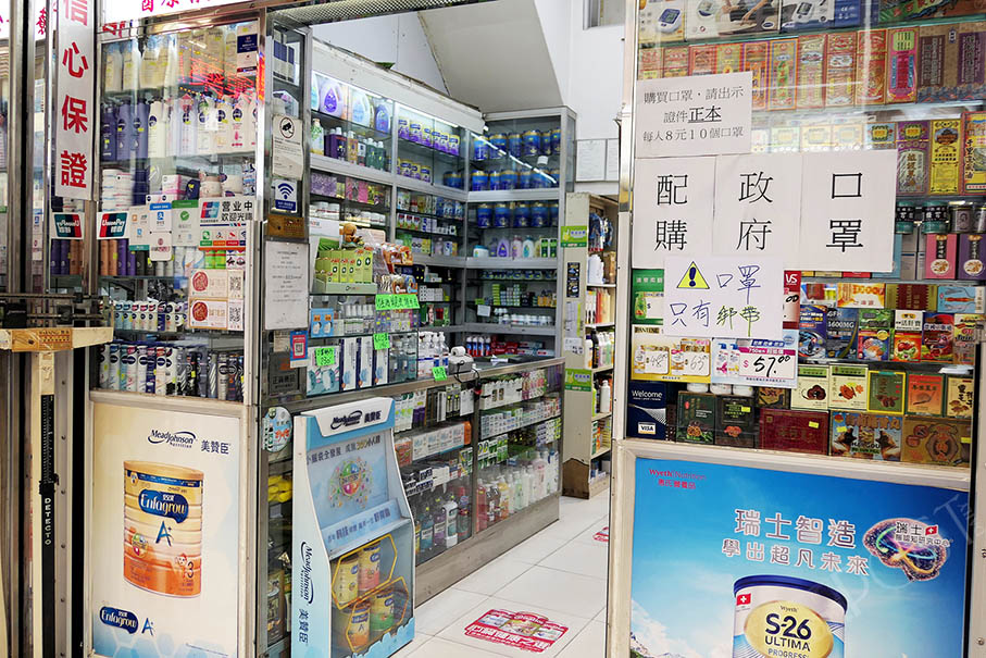 A notice is put up outside a pharmacy in the city centre saying that it sells the government’s facemasks, with another notice underneath saying that only tie-on facemasks are available.