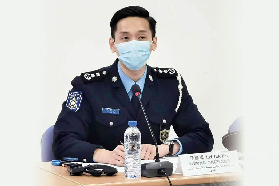 Lei Tak Fai, who heads the Public Security Police’s (PSP) Public Relations Division, addresses yesterday’s press conference at the Health Bureau (SSM) about the city’s novel coronavirus (COVID-19) situation. Courtesy: TDM