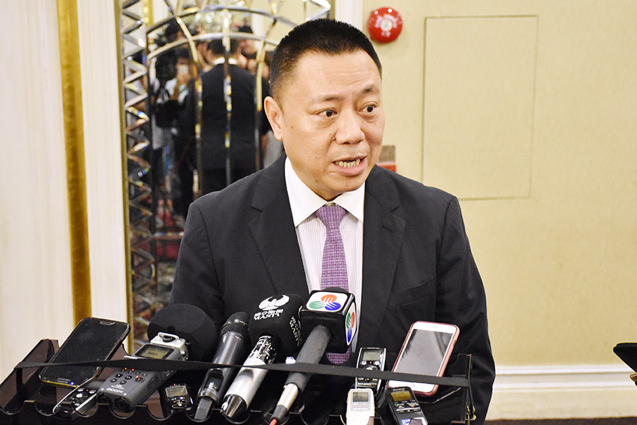 Secretary for Economy and Finance Lionel Leong Vai Tak speaks to reporters on the sidelines of yesterday’s reception celebrating the 8th anniversary of the Alliance of Common People Building Up Macau (API) at The Plaza Restaurant in Zape. – Photo: Leong Lok Ian