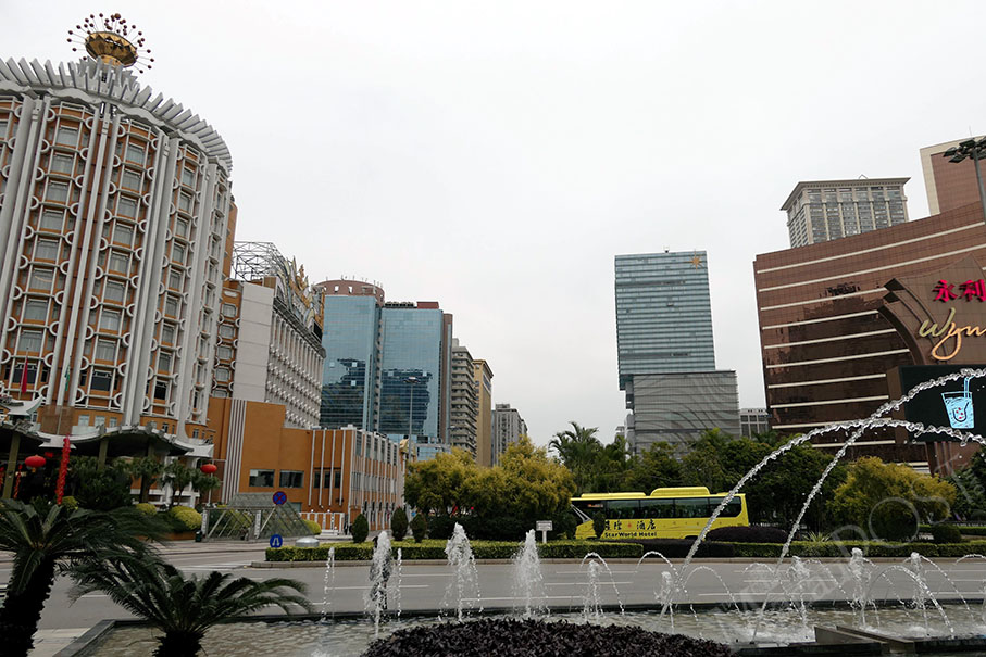 A bus drives past some of Macau’s best-known casinos yesterday. Photo: Iong Tat Choi