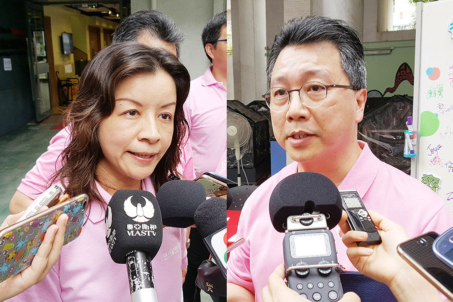 This combo-photo shows Social Welfare Bureau (IAS) President Celeste Vong Yim Mui (left) and Vice-President Peter Au Chi Keung speaking to the media on the sidelines of the opening ceremony of the bureau’s “Happy Family Month” event in Iao Hon yesterday. Photos: Davis Ip