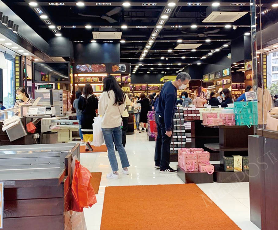 Shoppers buy snacks at a branch of a local brand known for its almond biscuits and meat jerkies that are popular among tourists.