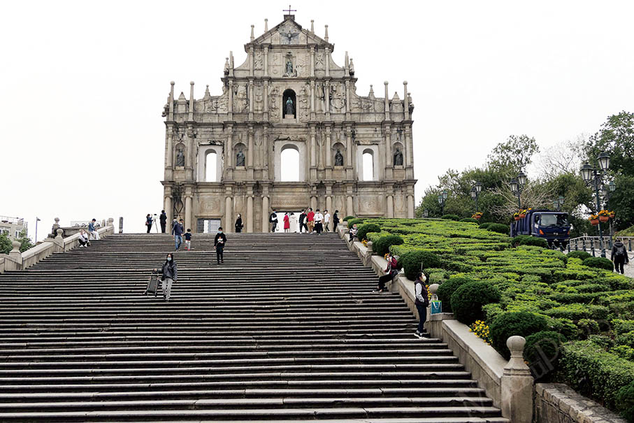 People walk near the Ruins of St. Paul’s. The usually crowded landmark has been quite deserted in February, and is only now seeing more people again there as shops and services have gradually reopened.