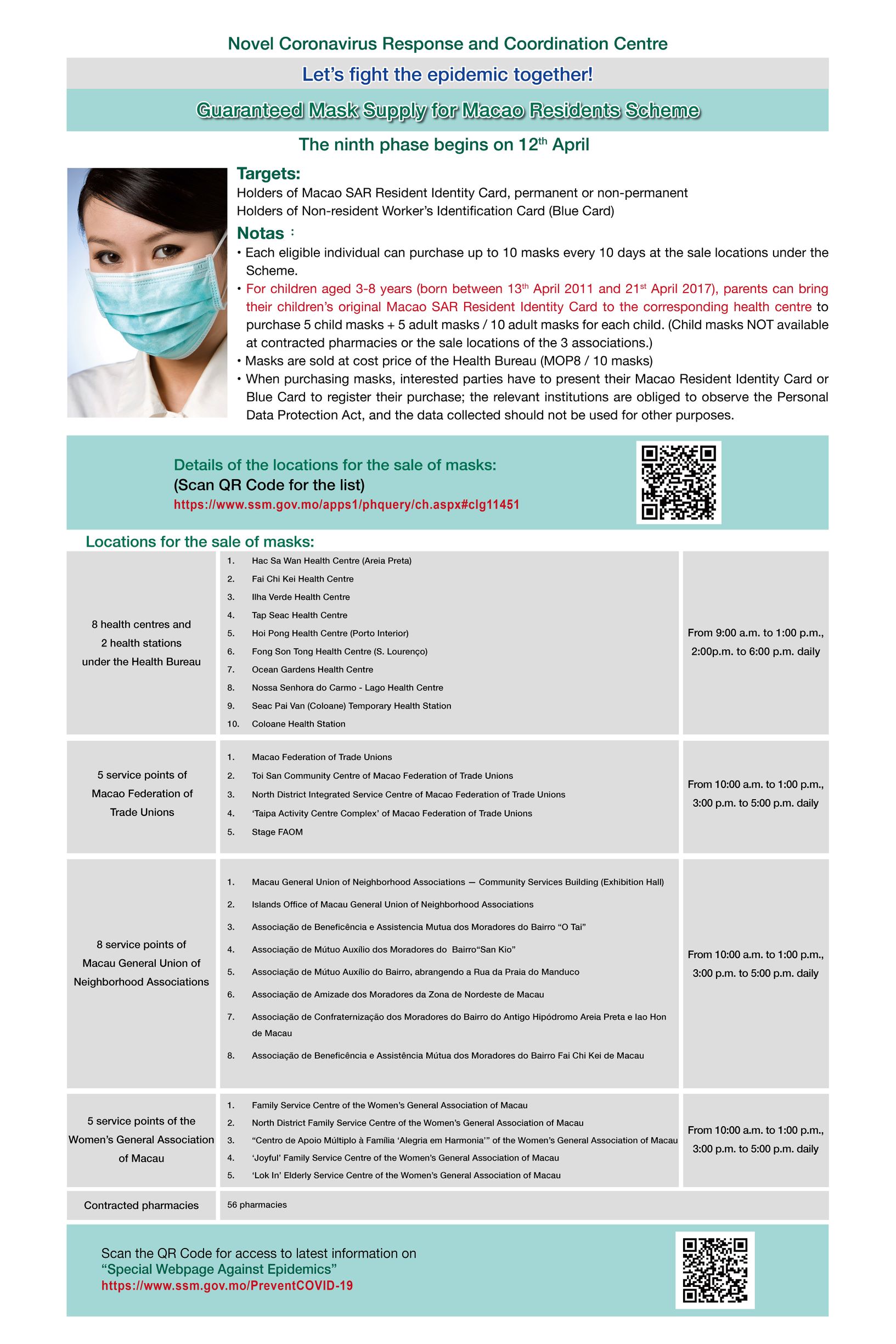 The Macau government announced today that its ninth round of facemask sales starts tomorrow.