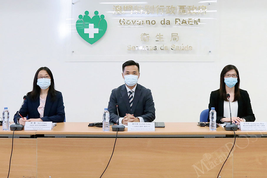 Alvis Lo Iek Long (centre), one of the three clinical directors of the public Conde de São Januário Hospital Centre, Health Bureau (SSM) Control of Communicable Diseases and Surveillance of Diseases Department Coordinator Leong Iek Hou (right), and Inês Chan Lou, who heads the Macau Government Tourism Office’s (MGTO) Licensing and Inspection Department, pose during yesterday’s press conference at the bureau about the city’s novel coronavirus (COVID-19) situation. Photo: GCS