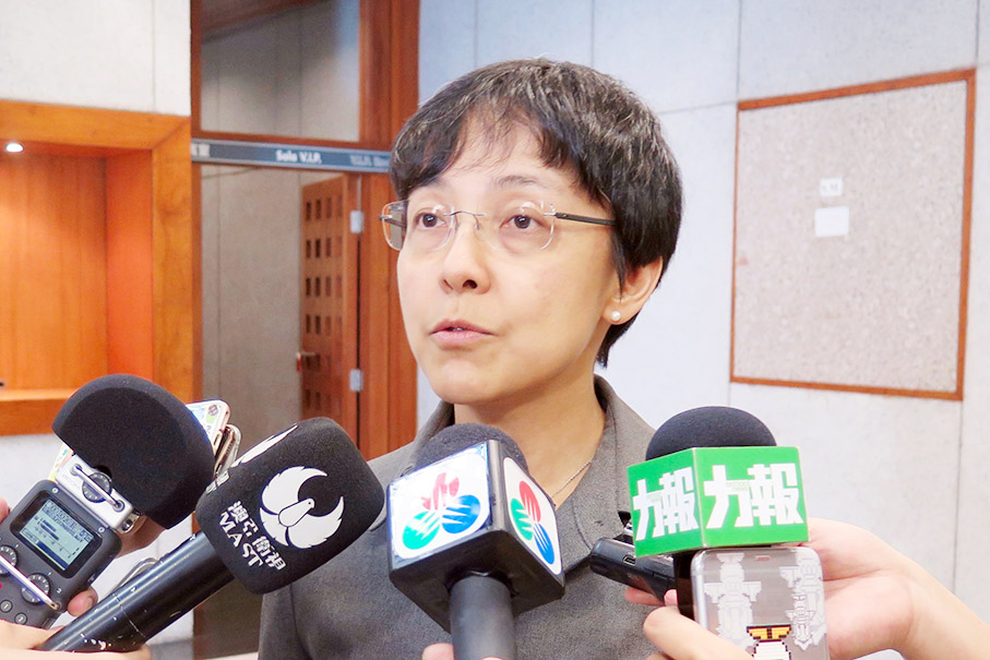 Macau Government Tourist Office (MGTO) Director Maria Helena de Senna Fernandes talks to reporters on the sidelines of a plenary meeting of the Tourism Development Committee at the Tourism Activities Centre (CAT) in Zape yesterday. Photo: Davis Ip